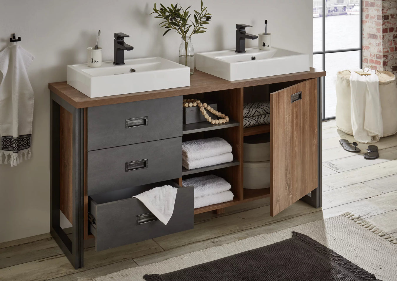 Original price €0,00 - Original price €0,00Original price €0,00€449,10€449,10 - €449,10Current price €449,10| /In stockMODERNER INDUSTRIELOOK – Kombination aus Stirling Oak und Matera verleiht dem Doppelwaschtisch einen trendigen Charakter mit wohnlicher Ausstrahlun...